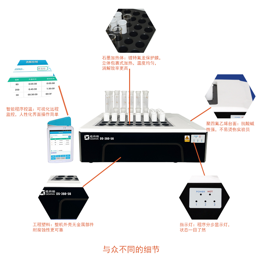 DS-360-56智能石墨消解儀具有56孔高通量設(shè)計,可快速實(shí)現(xiàn)樣品批量處理,滿足樣品量大的消解用戶;石墨材料作加熱體,孔間溫差±1.5℃,溫度均性好;無線控制,有效避免人員被酸霧及熱量傷害;設(shè)備操作簡單,消解快速,是樣品元素分析時消解的好助手。