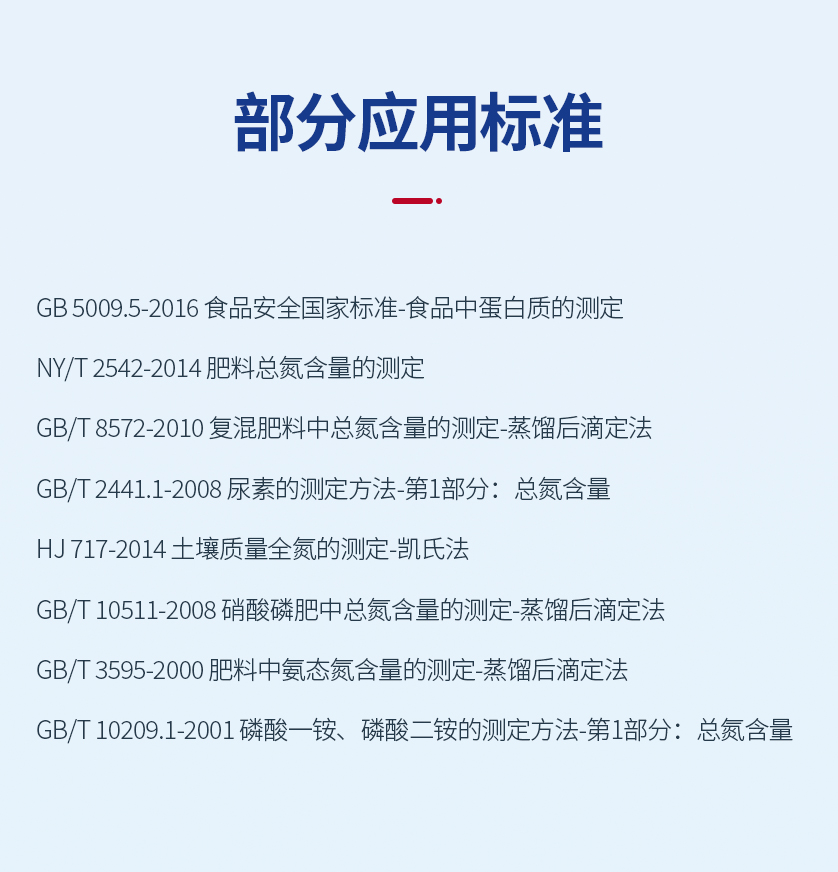 儀器采用凱氏定氮法的原理,用于食品、藥品、水產(chǎn)品、乳制品、化工、土壤、淤泥、谷物、植物、肥料、煙草、動(dòng)物飼料等樣品中全氮和蛋白質(zhì)含量的分析以及其它揮發(fā)性組分的分析。