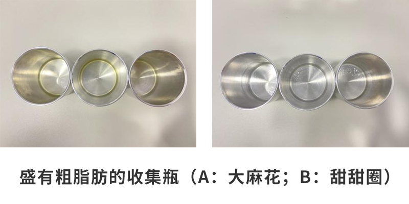 本次實驗測得大麻花樣品中的粗脂肪含量為24.08%,甜甜圈樣品中的粗脂肪含量為4.62%,且在重復性條件下獲得的兩次獨立測定結(jié)果的絕對差值未超過算術(shù)平均值的10%。